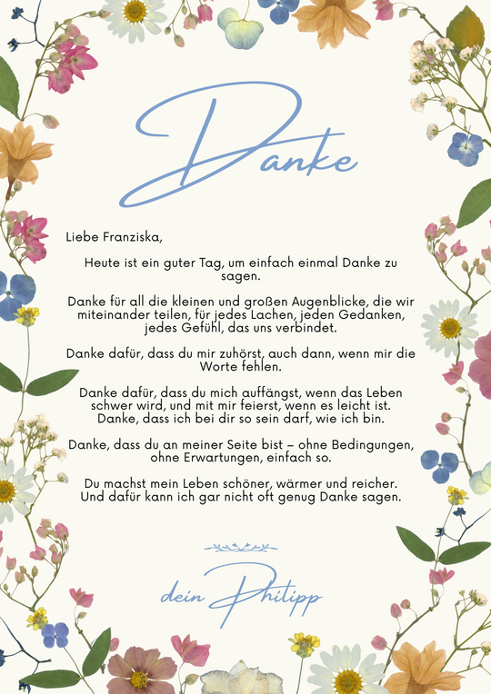 Damit es Ihnen leichter fällt, haben wir eine Briefvorlage für Sie vorbereitet, die Sie ganz einfach herunterladen und ausfüllen können. Schreiben Sie ein paar ehrliche Worte, zeigen Sie jemandem, dass er oder sie Ihnen wichtig ist, und schenken Sie ein Lächeln, das lange nachklingt.