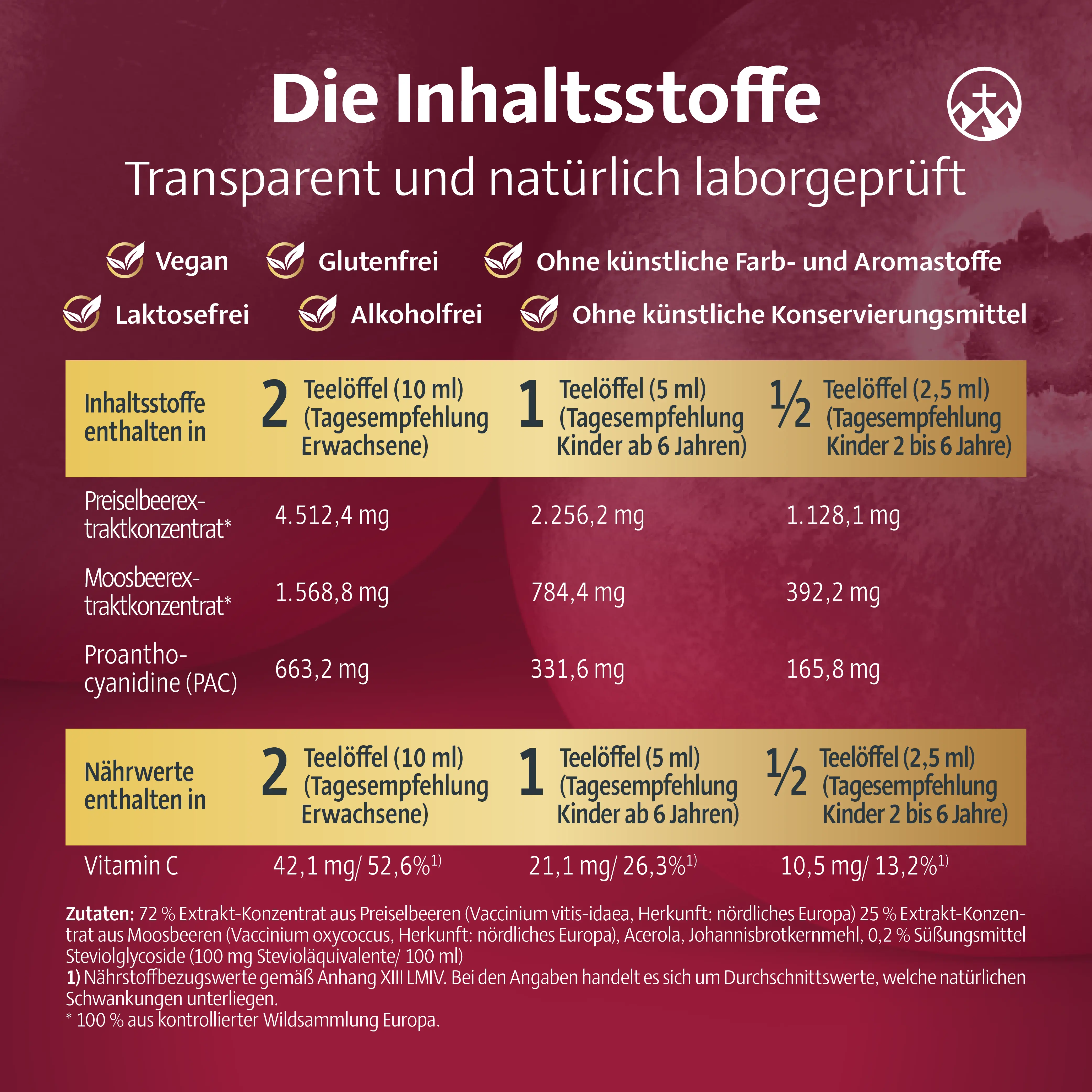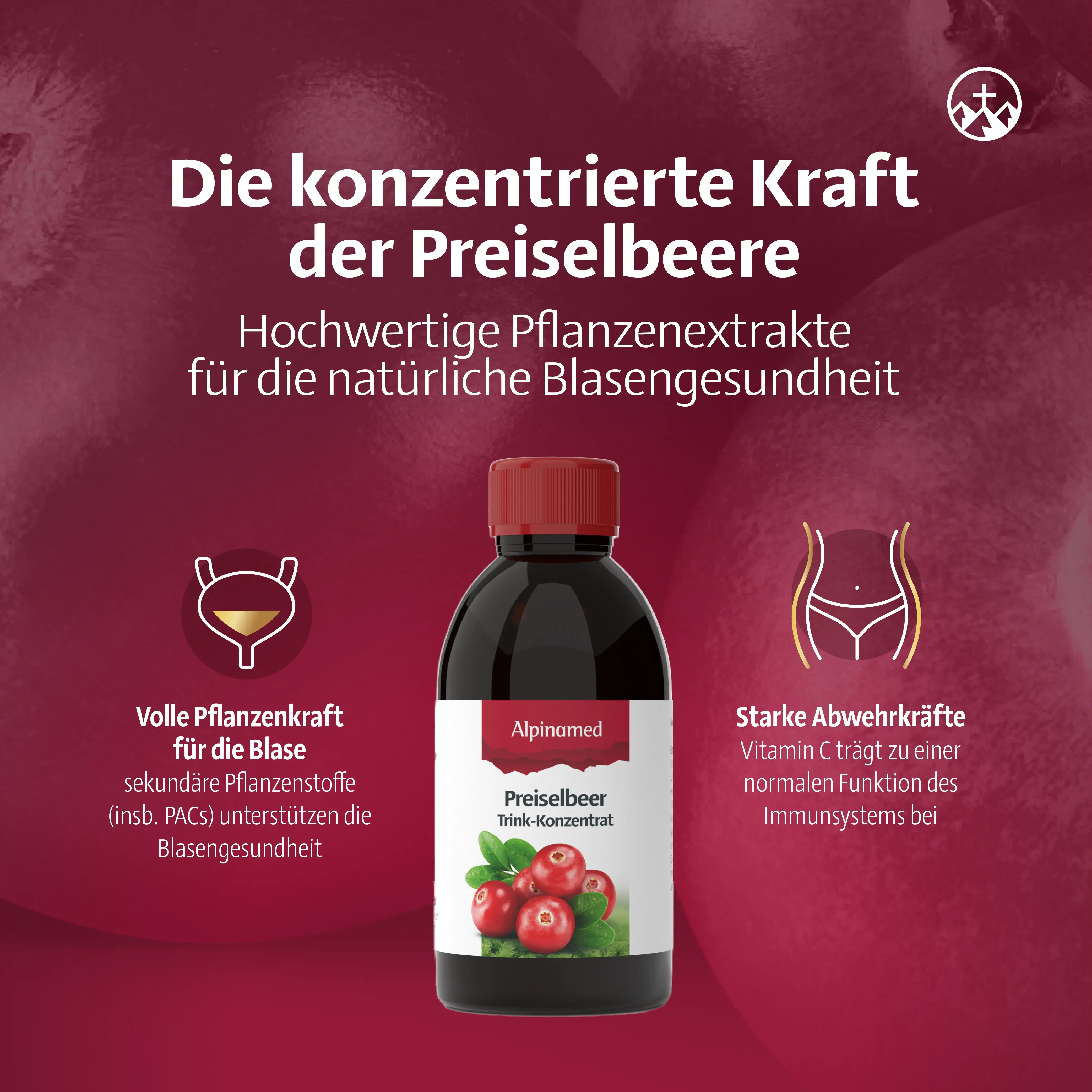 Alpinamed® Preiselbeer Trink-Konzentrat mit Vitamin C enthält einen hochwertigen Extrakt aus Preiselbeeren und Moosbeeren mit standardisiertem Gehalt an Proanthocyanidinen (PACs). Vitamin C unterstützt die normale Funktion des Immunsystems. Das ergiebige Konzentrat lässt sich in Wasser oder Tee verdünnen oder in Müsli, Joghurt, Brei bzw. Milchshakes einrühren. Es eignet sich besonders bei erhöhtem Bedarf und – in reduzierter Dosierung – auch für Kinder ab 2 Jahren, die den herben Preiselbeer-Geschmack weniger mögen,