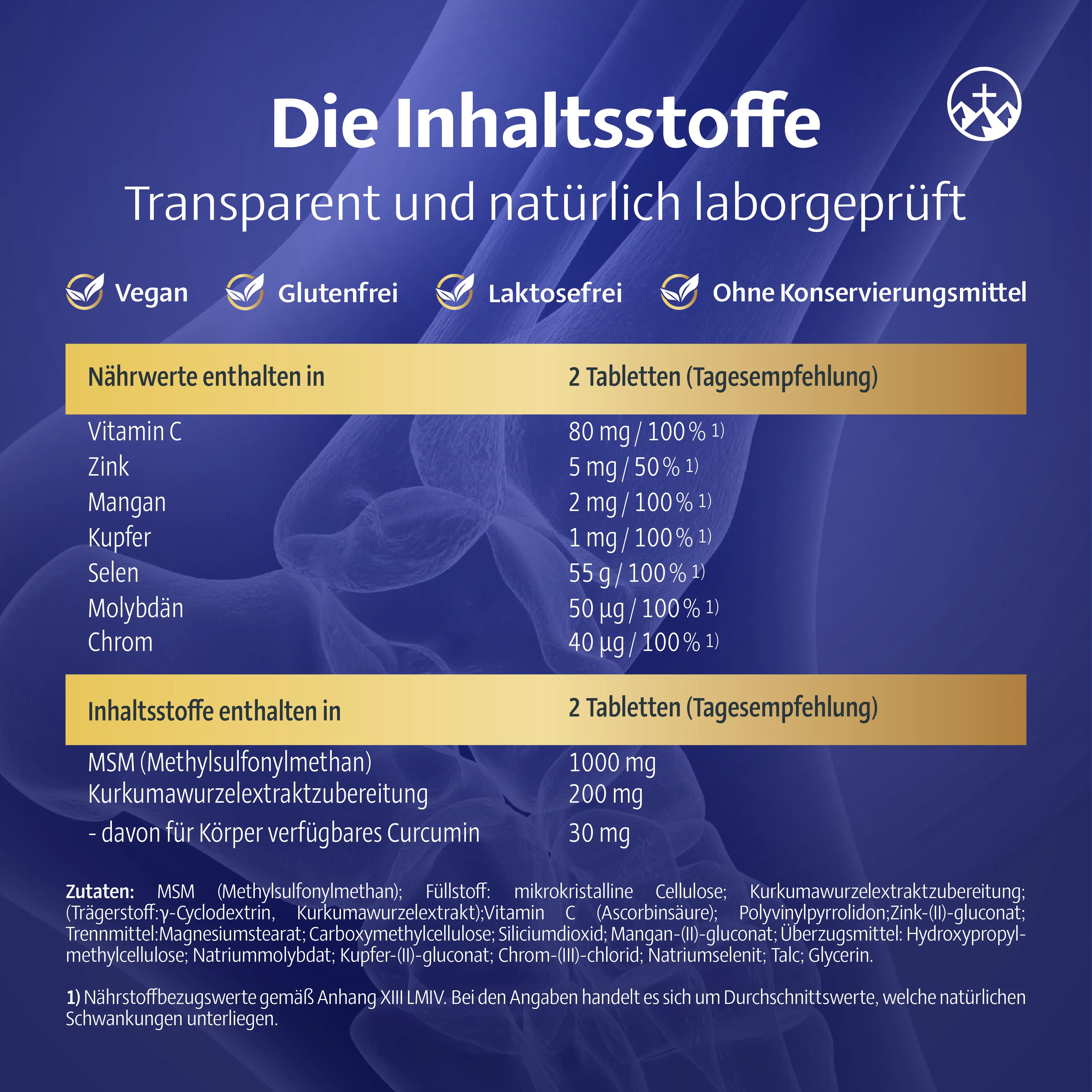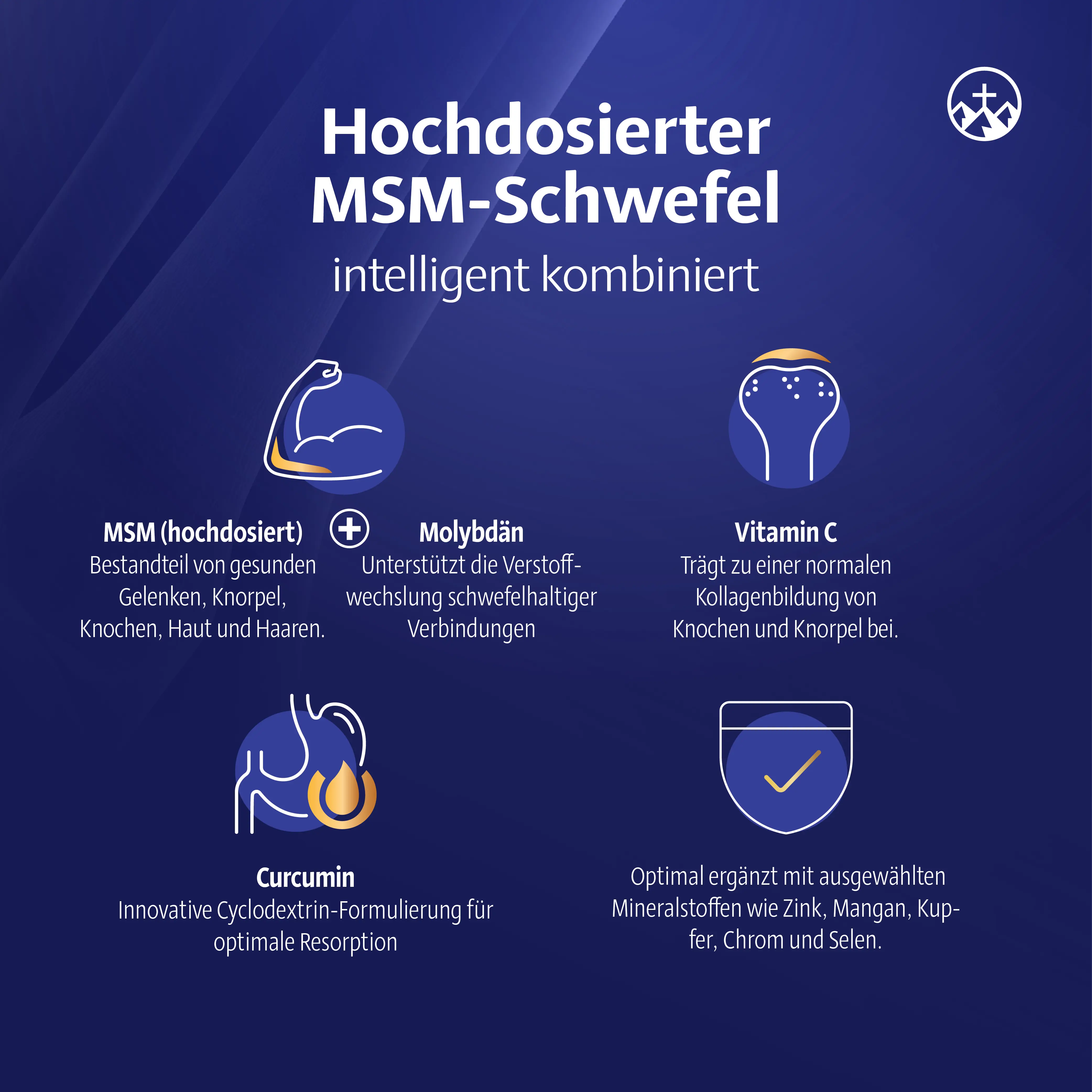 Alpinamed® MSM Arthro Tabletten enthalten, neben Vitamin C und vielen wichtigen Mineralstoffen, hochdosierten MSM-Schwefel. Dieser hilft bei der Gesunderhaltung geforderter und vernachlässigter Gelenke und unterstützt Profi- und Hobbysportler den erhöhten Nährstoffbedarf zu decken.