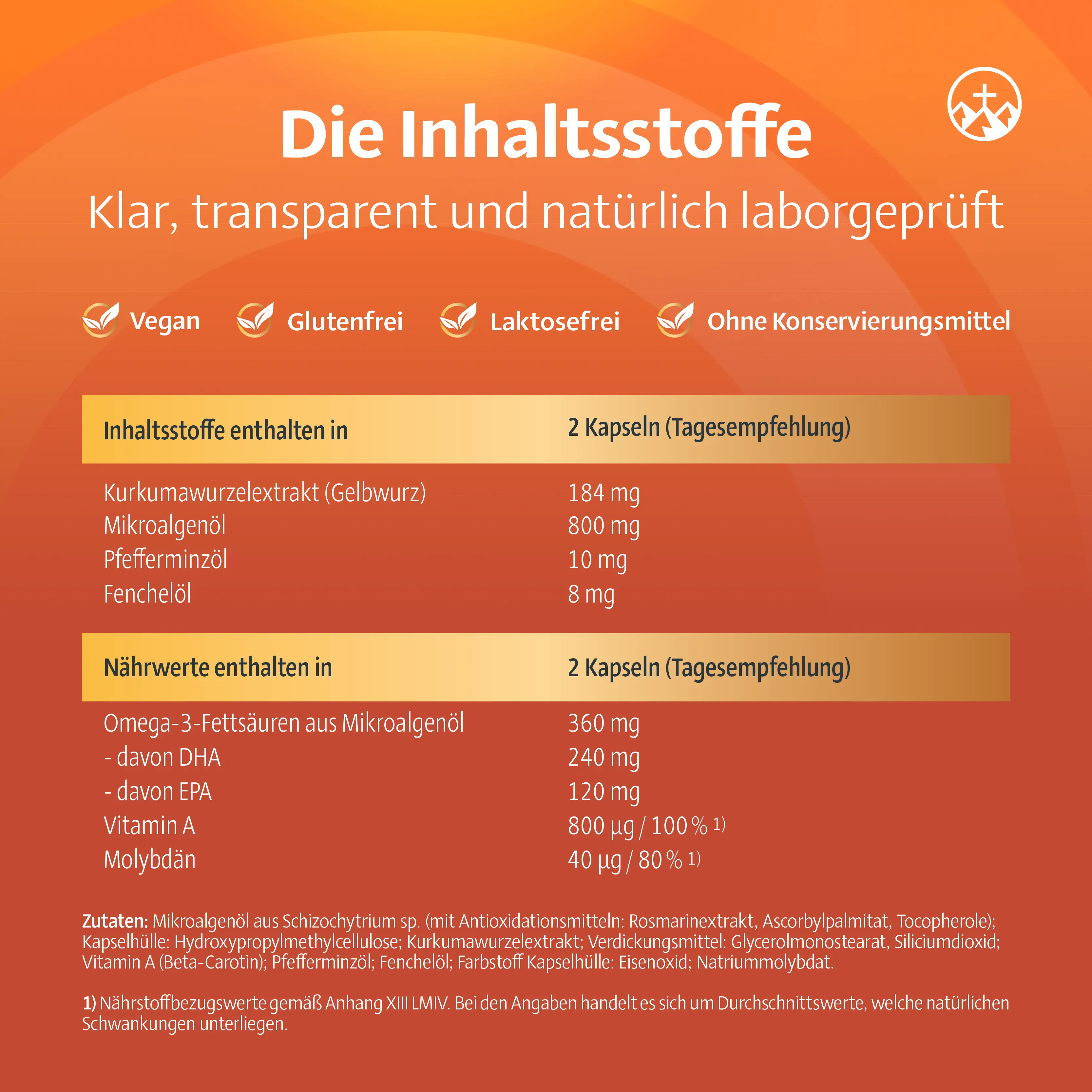 Im europäischen Raum hat Kurkuma eine lange Tradition in der Anwendung rund um das Thema Verdauung. Alpinamed® Curcuma Intest bietet natürliche Unterstützung für die Verdauung und zur langfristigen Darmpflege. Es verwöhnt den Verdauungstrakt mit Naturstoffen aus Kurkuma, Fenchel und Pfefferminze sowie veganen Omega-3 Fettsäuren aus Mikroalgenöl. Ergänzt werden die Pflanzenstoffe mit Molybdän und Vitamin A zur Pflege der Darmschleimhaut.