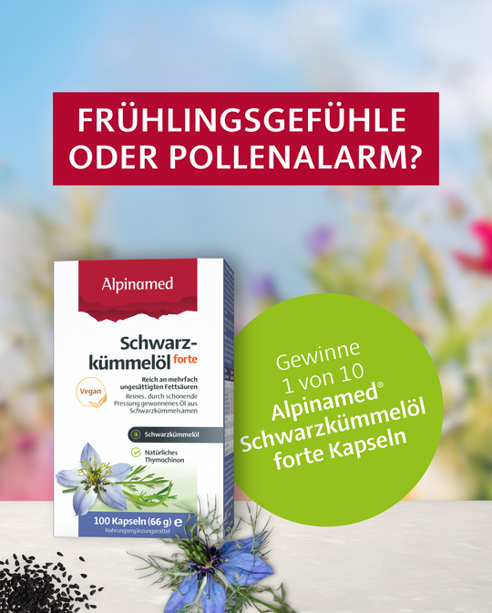 ☀️ Wie startest du in die neue Jahreszeit? Mit langen Spaziergängen durch erwachende Frühlingswiesen 🌸 oder mit einer Familienpackung Taschentücher? 🤧 Fülle das Formular aus und gewinne 1 von 10 Packungen Alpinamed® Schwarzkümmelöl forte zur Unterstützung deines Immunsystems in Zeiten erhöhter Belastung durch Pollen, Allergene oder Umweltreize.